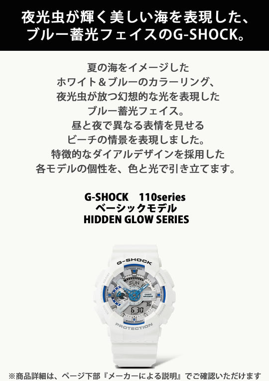 Klockan G-SHOCK HIDDEN GLOW SERIES visar människans potential med delar som lyser i mörker. Den har en vit och blå design inspirerad av sommarhav, med en lysande blå urtavla som skiftar från dag till natt. Varje modell framhäver sin unika taveldesign med färg och ljus. Modellen GA-2100HDS använder biobaserad plast i boettkrans och armband för att minska miljöpåverkan. Klockan passar både till vardag och arbete.