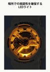 The watch includes shock resistance and 20-bar water resistance, making it suitable for various conditions. It also resists magnetic interference, meeting JIS1 standards. Additional features include a stopwatch, world time for 48 cities, a timer, five alarms, a full auto-calendar, and an LED light with adjustable afterglow.