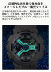 The G-SHOCK HIDDEN GLOW SERIES watch showcases human potential with glow-in-the-dark parts. It features a white and blue design inspired by summer seas, with a luminous blue face that changes from day to night. Each model highlights its unique dial design with color and light. The GA-2100HDS model uses biomass plastic for its bezel and band, aiming to reduce environmental impact. This watch suits both casual and work styles.