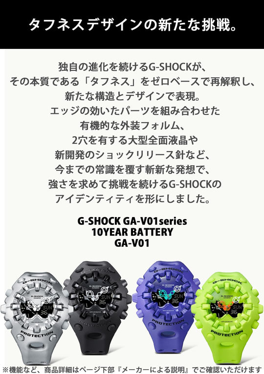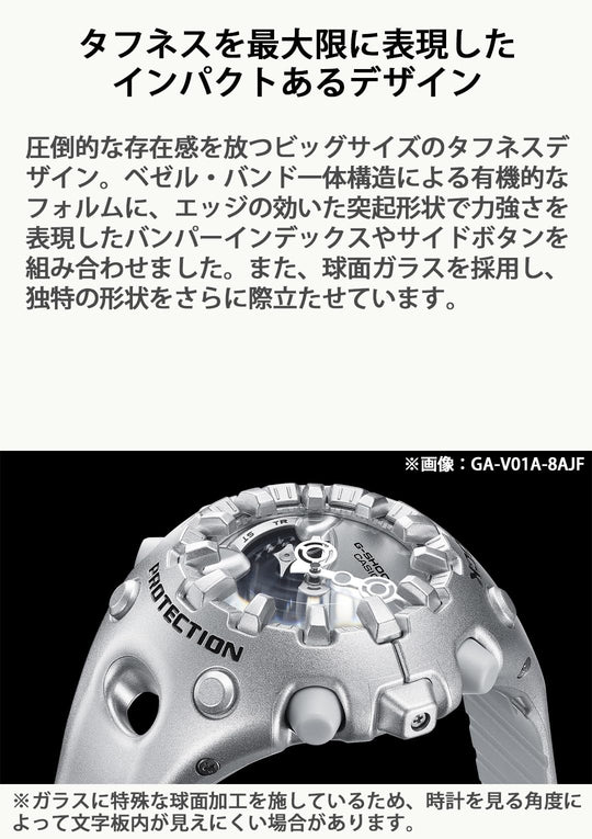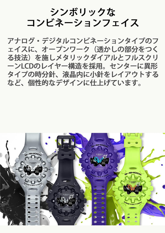 G-SHOCK-klockserien är ett bevis på innovation och motståndskraft, med en organisk exteriördesign som kombinerar kantiga element med en nyutvecklad stötdämpande visare. Denna design utmanar inte bara konventionella normer utan förkroppsligar också varumärkets engagemang för styrka och hållbarhet. Klockans struktur inkluderar ett mittboett skyddat av en integrerad ram och armband, med stora tredimensionella index som fungerar som stötdämpande stötfångare. Den unika kombinationen av en analog/digital urtavla, lagerstruktur och öppen urtavla förstärker dess robusta utseende.