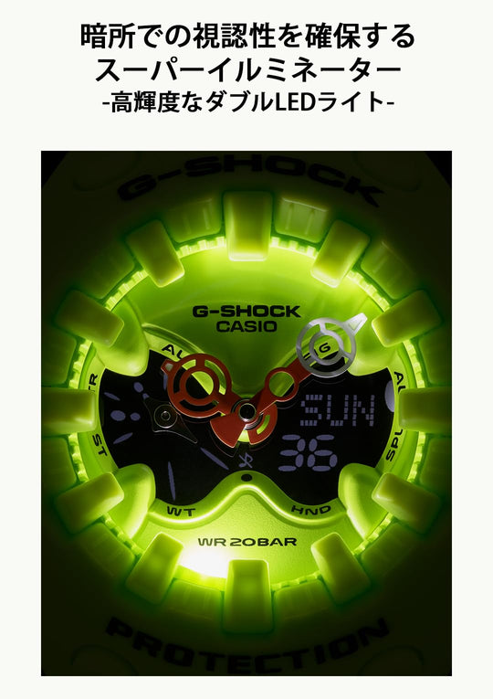 G-SHOCK-klockan är byggd med stöttålig konstruktion och är vattentät upp till 20 ATM, vilket gör den lämplig för olika miljöer. Den har en funktion för att ta bort visarna för att förbättra läsbarheten när visarna överlappar LCD-displayen. Klockan inkluderar också en världstidsfunktion som täcker 48 städer, en stoppur, en timer och ett tidslarm med fem larm och en tidssignal. Ytterligare funktioner inkluderar en helautomatisk kalender, 12/24-timmars visningsväxling och en ljud på/av-knapp för operation. Den dubbla LED-belysningen ger ljus för både urtavlan och LCD:n, med justerbara efterglödinställningar. Klockan drivs av ett högkapacitetsbatteri, som erbjuder cirka 10 års batteritid.