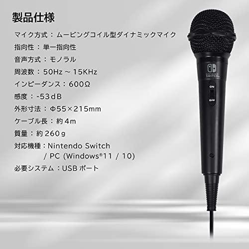 Denna högkvalitativa mikrofon ger dig möjlighet att enkelt njuta av karaoke hemma. Den ansluts till USB-porten inuti Nintendo Switch-dockan och är kompatibel med all hårdvara som kan anslutas via USB, inklusive Nintendo Switch och PC. Mikrofonen är utrustad med en högkänslig enhet som fångar upp ljud även när du rör munnen bort från mikrofonen, vilket gör det enklare att sjunga. Mikrofonens kropp är 215 mm lång (40 mm inuti holk), vilket gör den bekväm att hålla och njuta av. Den är också kompatibel med vårt mikrofonskydd, vilket gör att du kan sjunga utan att oroa dig för ljudläckage till omgivningen.