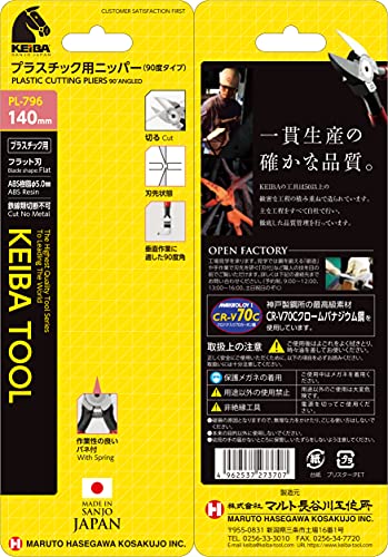 Produktbeskrivning: Bladet är fäst upp till skarvpartiet, så föremålet kan klippas även om det är insatt ända in till bladbasen●KEIBA:s avbitare för plast har den största marknadsandelen i Nordamerika●KEIBA:s unika och suveräna klippförmåga●Maltroy [[R1]], ett original högkvalitativt stålmaterial tillverkat av Kobe Steel, används●För klippning av ABS-harts, etc. För klippning av ABS-harts och andra material●Total längd (mm): 143●Klippförmåga (mm) Harts: φ5.0●Fjäderbelastad●Platt blad●90-graders typ●Martoroi [[R1]](KA70CRF2)Från Amazon●90-graders vinkel lämplig för vertikalt arbete●Med fjäder