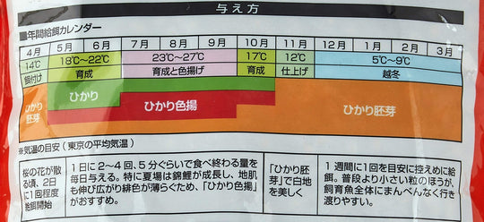 อาหารปลาฮิคาริ วีทเจิร์ม สำหรับปลาคาร์พ เป็นอาหารที่มีคุณค่าทางโภชนาการสูง ออกแบบมาเป็นพิเศษสำหรับปลาคาร์พและปลาบ่ออื่นๆ รวมถึงปลาทอง มีส่วนผสมของวีทเจิร์มที่ย่อยง่ายในปริมาณสูง ทำให้อ่อนโยนต่อระบบย่อยอาหาร แม้ในอุณหภูมิน้ำต่ำ ช่วยป้องกันปัญหาสุขภาพจากการย่อยอาหารไม่ดี โดยเฉพาะในช่วงอากาศหนาว เม็ดอาหารลอยน้ำช่วยให้สามารถตรวจสอบปริมาณการให้อาหารได้ง่าย ลดความเสี่ยงจากการให้อาหารมากเกินไป และช่วยรักษาคุณภาพน้ำ สูตรนี้มีวิตามินซีที่เสถียรเพื่อเสริมความต้านทานต่อความเครียดและการติดเชื้อ สนับสนุนสุขภาพและความมีชีวิตชีวาในระยะยาว การให้อาหารเป็นประจำช่วยปรับปรุงสภาพผิว ส่งเสริมสีสันที่สวยงาม และสนับสนุนสุขภาพการสืบพันธุ์ พัฒนาจากประสบการณ์การเลี้ยงปลาหลายปี อาหารนี้เหมาะสำหรับการใช้งานตลอดปี และมีประสิทธิภาพเป็นพิเศษในสภาพอากาศหนาว