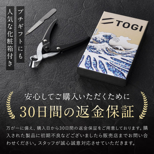 สินค้านี้เหมาะสำหรับการให้เป็นของขวัญ "TOGI" เป็นแบรนด์ที่มีความคิดสร้างสรรค์และส่งเสริมเทคนิคและประเพณีญี่ปุ่นสู่โลก บรรจุภัณฑ์มีการออกแบบผสมผสานสมัยใหม่ของภาพ "Fugaku Sanjurokkei (สามสิบหกทิวทัศน์ของภูเขาฟูจิ) Kanagawaoki Namiura" ของ Hokusai Katsushika ซึ่งได้รับความชื่นชมไม่เพียงแต่จากคนญี่ปุ่นเท่านั้น แต่ยังรวมถึงคนต่างชาติด้วย กรรไกรตัดเล็บที่มีประวัติยาวนานนี้ยังเป็นของขวัญที่แนะนำสำหรับคนที่คุณรัก กล่องสามารถจัดแสดงพร้อมกับเบาะสีแดงด้านในได้