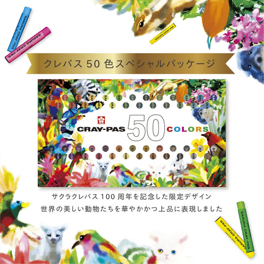 ชุดสีเทียนรุ่นลิมิเต็ดเอดิชั่นนี้มีทั้งหมด 50 สี เพื่อเฉลิมฉลองครบรอบ 100 ปีของซากุระเครยพาส ดีไซน์ของชุดนี้มีความสดใสและหรูหรา โดยมีภาพสัตว์สวยงามจากทั่วโลก ทำให้เป็นของขวัญที่เหมาะสำหรับโอกาสต่างๆ เช่น การเข้าโรงเรียนหรือวันเกิด การออกแบบบรรจุภัณฑ์ยังมีหน้าต่างให้เห็นการไล่สีของเทียนสี เพิ่มความน่าสนใจในฐานะของที่ระลึกพิเศษ