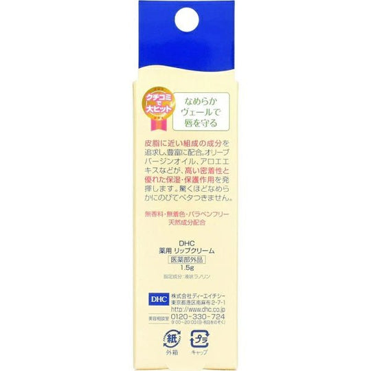 ครีมทาปาก DHC Medicated Lip Cream ประกอบด้วยน้ำมันออลิฟตรงค์, สารสกัดอโลเวร่า, สารสกัดจากรากขมิ้น, วิตามิน E, และสารป้องกันอื่น ๆ สมรรถภาพในการทำให้ชื้นที่ยอดเยี่ยมช่วยป้องกันการแห้งและปกป้องริมฝีปากอย่างอ่อนโยน.