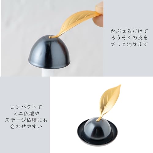 ที่ดับเทียนนี้ออกแบบมาให้วางลงบนเปลวเทียนเพื่อดับมัน ขนาดที่กะทัดรัดและดีไซน์ที่มีสไตล์ทำให้เหมาะสำหรับหิ้งพระทั้งแบบดั้งเดิมและแบบสมัยใหม่ รวมถึงหิ้งพระขนาดเล็กและบนเวที มีให้เลือกสองสี คือ สีเงินอิบุชิกินและชิเกคิน คุณสามารถเลือกสีที่เข้ากับหิ้งพระและอุปกรณ์อื่นๆ ได้ดีที่สุด ขนาดที่กะทัดรัดยังทำให้พกพาได้ง่าย สะดวกในการใส่กระเป๋าเมื่อต้องไปเยี่ยมสุสาน