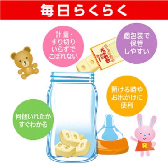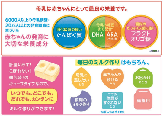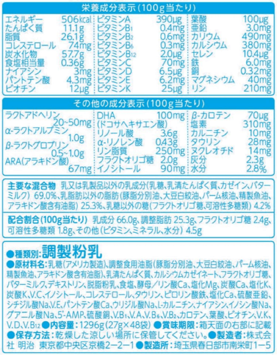 ส่วนประกอบ: แลกโตส, น้ำมันและไขมันที่ปรับเปลี่ยนได้ (น้ำมันส่วนของไขมันหมู, น้ำมันถั่วเหลืองขาว, น้ำมันเมล็ดปาล์ม, น้ำมันปลาที่ทำความสะอาด, กรดอาราคิโดนิคที่อยู่ในไขมัน), โปรตีนวาย, แคเซอีน, ฟรักโทออลิโกแซคคาไรด์, เด็กซ์ทริน, น้ำตาลไขมัน, ผงนมจืด, เกลือ, สารสกัดฟอสโฟลิปิดที่มาจากนม, ยีสต์, เหล็กไพโรฟอสเฟต, แคลเซียมคาร์บอเนต, แคลเซียมฟอสเฟต, โพแทสเซียมคาร์บอเนต, วิตามิน C, โมลิเบเดฟ-ลุนคลอไรด์, แมกนีเซียมคลอไรด์, อิโนซิทอล, กลูโตไฮโดเจนไคลอไรด์, คอเลสเตอรอล, ทัวรีน, วิตามิน E, แคลเซียมคลอไรด์, สังกะสีซัลเฟต, นาเซียมไซทิดิลิกแอซิด, วิตามิน A, วิตามิน D, แคลเซียมแพนโทเทเนต, นาเซียมยูริดิลเลท, L-คาร์นิทีน, ไนแอซิน, นาไซโนซิเนท, นากัวนิลิกแอซิด, 5-AMP, สังกะสีซัลเฟต, วิตามิน B1, วิตามิน B2.