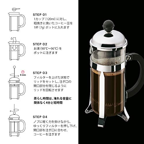การผสมผสานระหว่างกระจกทนความร้อนและโครงสร้างโลหะเป็นแบบฉบับอันแท้จริงของออกแบบปั๊มกาแฟฝรั่งเศส ด้ามสีดำไม่เพียงแค่จับง่ายเท่านั้น ยังคลาสสิกและมีความสง่างาม CHAMBORD ได้แรงบันดาลใจโดยตรงจากเครื่องดื่มกาแฟแบบปั๊มฝรั่งเศสที่ได้รับความนิยมในปารีส ฝรั่งเศสในยุค 1950 จนไปถึงฝาและโครงสร้างที่ผลิตอย่างรอบคอบหนึ่งตัวต่อหนึ่งผ่านกระบวนการผลิตที่คลุมคลุงประณีต เพื่อให้แน่ใจว่าจะคงความเงางามไว้ถึงหลังจากที่ใช้งานมาหลายปี ออกแบบที่เป็นมิตรกับสิ่งแวดล้อม มีประสิทธิภาพ และมีฟังก์ชั่นคือคุณภาพและเหตุผลที่ทำให้คนจำนวนมากในทุกที่ทั่วโลกยังคงรักเครื่องชงกาแฟของเรา กาแฟฝรั่งเศสถึงน้ำร้อนเริ่มต้นที่อุณหภูมิ 92๚C ถึง 96๚C ซึ่งเป็นอุณหภูมิที่เหมาะสมสำหรับการสกัดส่วนผสมของเมล็ดกาแฟให้ได้มากที่สุด เพื่อให้แน่ใจว่าเมล็ดจะขยายออกมา ได้ชิมรสชาติที่อุดมด้วยกาแฟที่พร้อมกับรสของเมล็ดกาแฟที่ถูกนำมาสู่สูงสุดแล้ว.