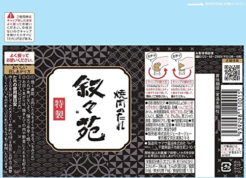 ÜrünlerJyo-en" yakiniku uzmanı restoranın yıllar boyu misafirperverliği ile geliştirdiği otantik yakiniku sosu. Bu sos, çeşni verme için "Momodare" ve ızgara sonrası daldırma için "Sute-dare" karışımıdır. "Jyo-en" restoranlarında servis edilenlere benzer tatlı bir tada sahiptir.[1 Izgara öncesi\, eti sos ile iyice baharatlayın. 2Eti, sosun yanmasını önlemek için yüksek ateşte hızlıca ızgaraya koyun. 3Servis yaparken\, ızgara sonrası dilediğiniz gibi eti ve sebzeleri sosa batırın.Besin Değerleri[Besin Değerleri 15ml başına] Enerji 41Kcal\, Protein 0.9g\, Yağ 0.6g\, Karbonhidrat 7.9g\, Sodyum 455mg\, Tuz eşdeğeri 1.2gİçindekiler/İçindekiler: Soya sosu (Japonya)\, Şeker (Japonya)\, Mirin (Japonya)Uyarılar (Sorumluluk Reddi) Lütfen dikkatlice okuyunŞişeyi açtıktan sonra\, lütfen buzdolabında saklayın ve mümkün olan en kısa sürede servis yapın.