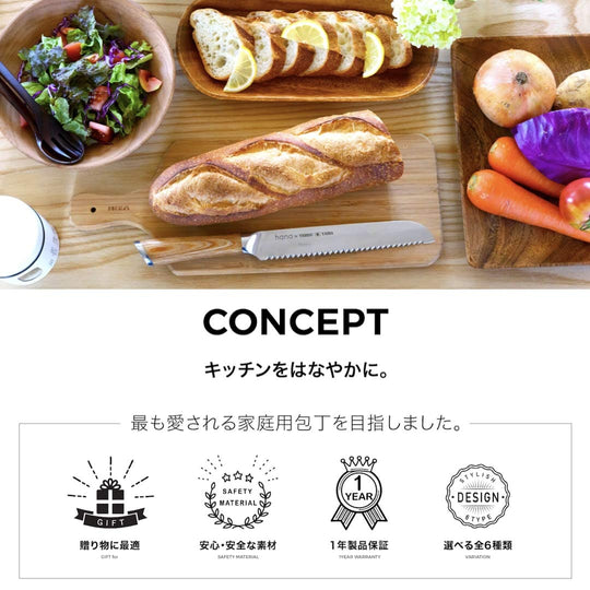 hana serisi altı tür bıçak içermektedir: Santoku bıçağı, Batılı Santoku (Gyuto), Et bıçağı (Kasap dilimi), Ekmek bıçağı, Petit bıçağı ve Soyacak bıçağı (doğrama bıçağı). İhtiyacınıza en uygun olanı seçin.