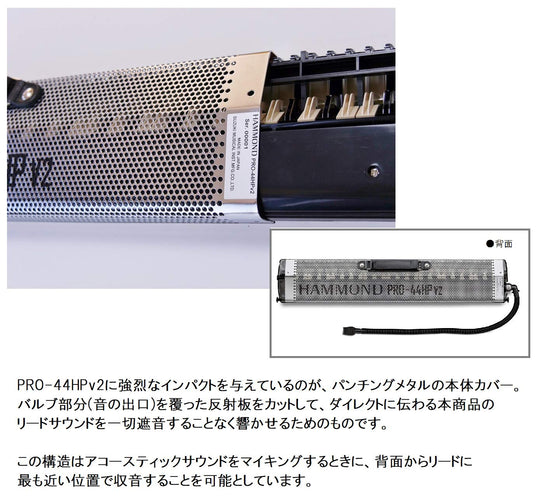 PRO-44HPv2, tüm bant genişliğinde azaltılmış perküsyon gürültüsü ile net bir lead sesi sağlayan dahili bir pikap mikrofona sahiptir. Titreşim malzemesi olarak kullanılan PET levha, orta-yüksek aralığı vurgulayarak yoğun ses manzaralarına sahip müziklerde güçlü bir varlık sağlar. Delikli metal gövde kapağı, doğrudan kamış sesinin yalıtım olmadan yankılanmasına olanak tanır ve akustik deneyimi artırır.