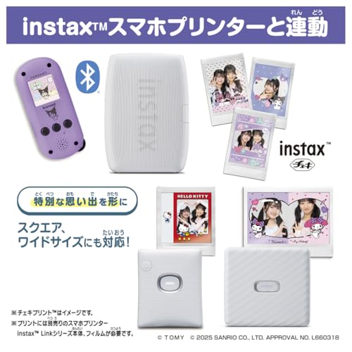 In ảnh yêu thích bằng máy in smartphone dòng instax Link (máy in và phim bán riêng). Cần 3 pin kiềm AAA (không kèm theo). Trong hộp: máy ảnh FUNSHOT x1, sách hướng dẫn x1. Nhãn hiệu: instax và Cheki là nhãn hiệu của Fujifilm. © TOMY. © 2025 Sanrio Co., Ltd. Cảnh báo an toàn: không có.