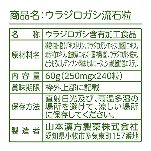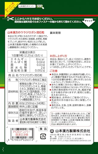 Yamamoto Kampo Uradoogashi Ryuseki Granule 240 là một thực phẩm bổ sung được thiết kế để duy trì sức khỏe hàng ngày. Sản phẩm chứa Uradoogashi là thành phần chính, phối hợp với kanezou, akamegashi và kumaragi dưới dạng hạt granule dễ nuốt. Sản phẩm này không nhằm chữa bệnh hay cải thiện sức khỏe thông qua liều lượng cao. Đây là thực phẩm bổ sung và không nên dùng quá liều lượng cần thiết. Vui lòng tham khảo ý kiến bác sĩ nếu bạn đang điều trị thuốc, đang điều trị tại bệnh viện, mang thai hoặc cho con bú. Không sử dụng sản phẩm này nếu bạn có điều kiện sức khỏe hoặc dị ứng với thực phẩm. Nếu có bất kỳ khó chịu về thể chất nào, hãy ngừng sử dụng ngay lập tức. Vì là thành phần tự nhiên, màu sắc và hương vị có thể thay đổi. Giữ xa tầm tay trẻ em. Duy trì chế độ ăn uống cân bằng dựa trên bữa ăn chính, rau củ và món phụ.