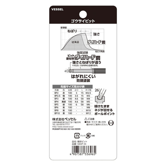 Dòng mũi khoan mạnh nhất từ trước đến nay, được chế tạo từ thép siêu cứng với độ cứng ấn tượng HRC62, thiết kế dành cho nhiều hoạt động vặn ốc khác nhau. Mũi khoan này có độ bền cao, khả năng chống cong vênh hoặc gãy, và đảm bảo truyền lực vặn chính xác để đảm bảo an toàn khi cố định. Logo VESSEL được hiển thị rõ nét, đảm bảo không bị nhòe như các mũi khoan sơn. Nó có đầu dạng bi với góc nghiêng 26 độ, lý tưởng để tiếp cận các không gian chật hẹp và kín đáo.