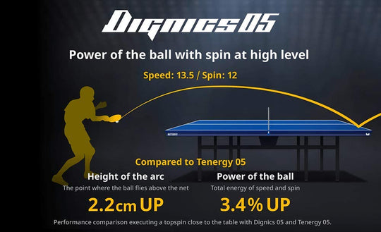 Dignics 05 áp dụng cấu trúc gai Code No. 05 cho độ xoáy cao, lý tưởng cho lối chơi tấn công thiên về xoáy như giật mạnh và phản công ở cự ly gần đến trung bình. Thông số: Tốc độ 13.5, Độ xoáy 12, Độ cứng mút 40, Tùy chọn độ dày mút: Siêu dày, Dày; Màu: Đỏ, Đen.