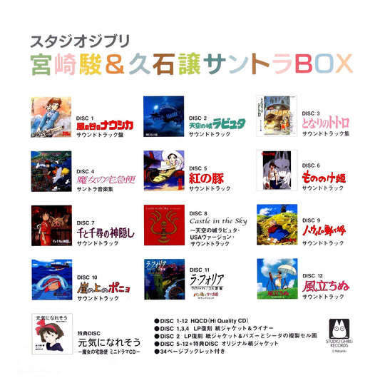 Bộ hộp sang trọng này bao gồm 12 bản nhạc phim từ các tác phẩm biểu tượng của Hayao Miyazaki, từ "Nausicaa of the Valley of the Wind" đến "The Wind Rises," tất cả đều do Joe Hisaishi sáng tác. Bộ sản phẩm đi kèm với một bìa giấy tái hiện hoàn hảo "bìa LP huyền thoại" từ các lần phát hành phim. Ngoài ra, một đĩa CD tặng kèm cung cấp một mini-drama từ "The Witch's Delivery Service," làm cho nó trở thành một bộ sưu tập quý giá cho những người hâm mộ Studio Ghibli.