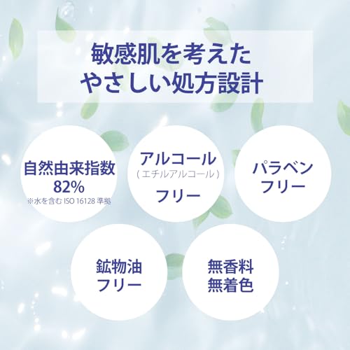 Kết cấu dày đặc làm giảm cảm giác ma sát và đủ êm dịu cho làn da nhạy cảm. Nó cung cấp độ ẩm tươi mới và mang lại làn da mịn màng và sáng rõ với việc sử dụng hàng ngày. Sản phẩm tự hào với chỉ số xuất xứ tự nhiên 82% (bao gồm cả nước) và tuân thủ ISO 16128. Không chứa cồn (ethyl alcohol), paraben (chất bảo quản), dầu khoáng, hương liệu, và chất tạo màu. Đã được kiểm tra dị ứng và thực hiện các thử nghiệm sử dụng liên tục với sự hợp tác của làn da nhạy cảm. Ngoài ra, cũng đã thực hiện các thử nghiệm đắp vá và kích ứng da (lưu ý rằng không phải tất cả mọi người đều không bị dị ứng hoặc kích ứng da).