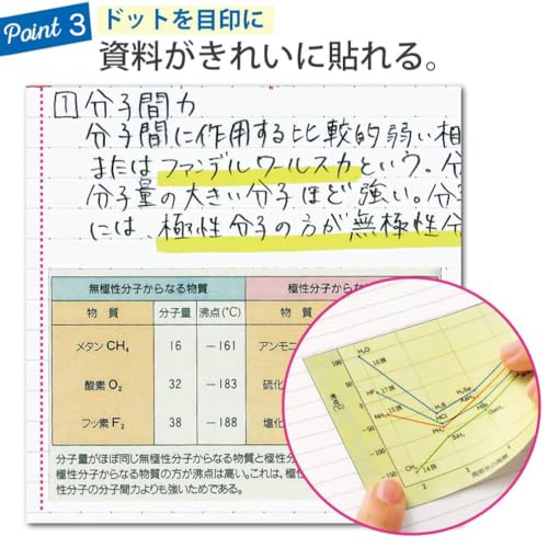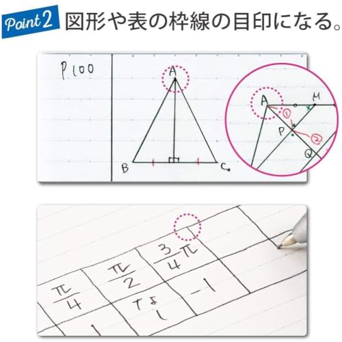 Sổ tay có chấm giúp việc viết trở nên đẹp hơn. Các chấm được bố trí cách đều nhau trên các dòng kẻ, giúp bạn viết gọn gàng và ôn tập hiệu quả. Điều này giúp việc học tập trở nên hiệu quả hơn. Sổ tay được thiết kế để giúp bạn căn chỉnh vị trí bắt đầu của các câu một cách gọn gàng, đánh dấu các đỉnh của hình vẽ và kẻ các đường thẳng đến mép giấy ngay cả khi sử dụng thước ngắn. Ngoài ra, các chấm cũng có thể được sử dụng như các điểm đánh dấu để dán tài liệu một cách gọn gàng và căn chỉnh chữ khi viết dọc. Gói năm màu giúp dễ dàng phân loại theo môn học hoặc theo mục đích sử dụng.