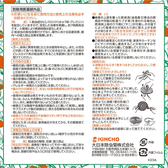 使用时,取一片螺旋形蚊香,点燃一端,让其逐渐阴燃。确保香炉正确放置,"KINCHO"标志可见。点燃后,熄灭火焰,让蚊香水平阴燃。