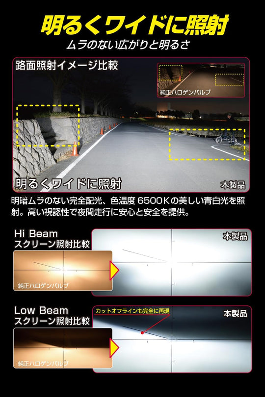 僅供頭燈使用,適用於 H11 鹵素替換型燈座;購買前請確認車輛相容性與後方安裝空間(不相容於帶燈體後蓋的燈具,部分車款安裝時可能需要拆燈)。主要為日本製車輛設計;部分外國車款也可能適用—請查閱相容清單確認。法規:色度落在 JIS D5500 範圍內,但各地檢驗結果可能不同;如需通過檢驗,請改回原廠燈泡。注意:部分車輛可能出現燈泡故障警示或收音機雜訊;可能影響以原廠燈泡設計的 ADAS 系統;散熱較低可能無法融化燈罩鏡片上的積雪或結冰。請確保接頭完全插緊,以免過熱。計程車與商用車不在保固範圍內。
