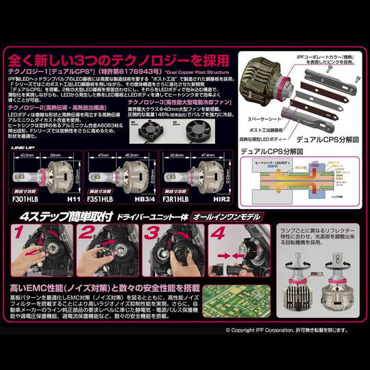 IPF H11 LED頭燈燈泡 5000lm 6500K 12/24V 風扇散熱 F-Series F301HLB 冷白光 (2pcs)