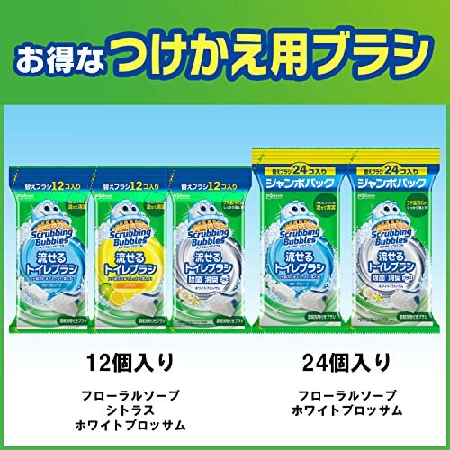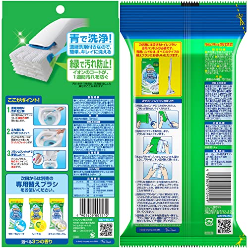 此可沖洗馬桶刷花香皂香味包裝,在其中包含一個主體單位和16個替換套組件。每一套包含4個花香香皂味的刷子和12個花香香皂味的刷子。此刷子旨在一次性使用,清潔後可直接沖走。產品特色是一種特殊不織布,由能徹底清洗並沖走的材料製成。主體的彎曲拱形設計,使得刷子能夠繞到看不見的邊緣,特殊的不織布和不均勻的刷子可以徹底清除污垢。