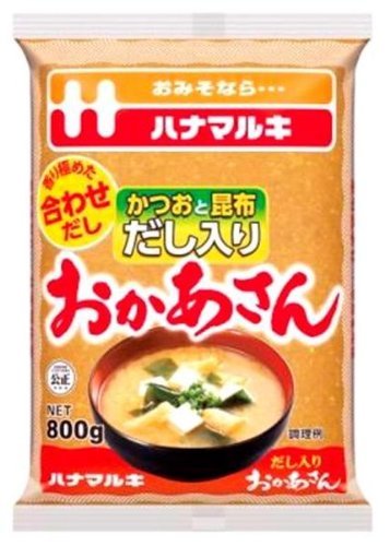 Hanamaruki的Okasan味增帶有出汁,是一種注重材料和製造的淺色味增。它由大豆(非基因改造),大米,鹽,昆布出汁,鰹魚提取物,鰹魚粉,炙燒魚粉,清酒精,調味料(氨基酸等)以及煙熏味組成。來自野生黃色和鰹魚(鰹魚)和昆布(昆布)出汁湯底的組合,創造出明亮且芬芳的味增。這款800g包裝的味增味道豐富,並且採用便利的枕頭型包裝以減少浪費。