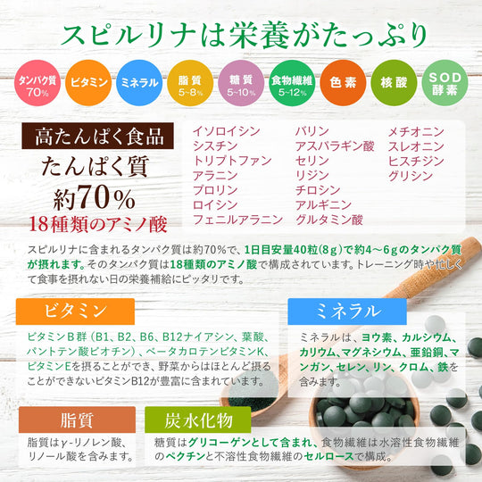 這款螺旋藻補充劑已經是超過40年的信賴健康食品,擁有眾多回購的顧客。由營養豐富的藻類製成,螺旋藻常被稱為「天然食品之王」,被視為超級食物。特別推薦給擔心蔬菜攝取不足或飲食不均衡的人士。螺旋藻天然含有70%的蛋白質,還有維生素、礦物質、膳食纖維、碳水化合物、脂質、核酸和色素。作為鹼性食品,它有助於支持均衡飲食和整體健康。這款補充劑設計為日常的健康、營養和美容護理的支持。