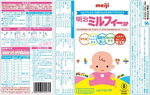明治Milfy HP產品使用低分子肽為蛋白質來源,經由優質乳清蛋白的酶解降解,使其具有良好的風味並有效地降低過敏性。它不含乳糖,適用於有牛奶過敏、先天乳糖不耐症、半乳糖血症或瞬間乳糖不耐症的嬰兒,可作為母乳或配方奶的替代品。明治Milfy HP已被消費者事務局認證為不含牛奶過敏原及不含乳糖的食品。