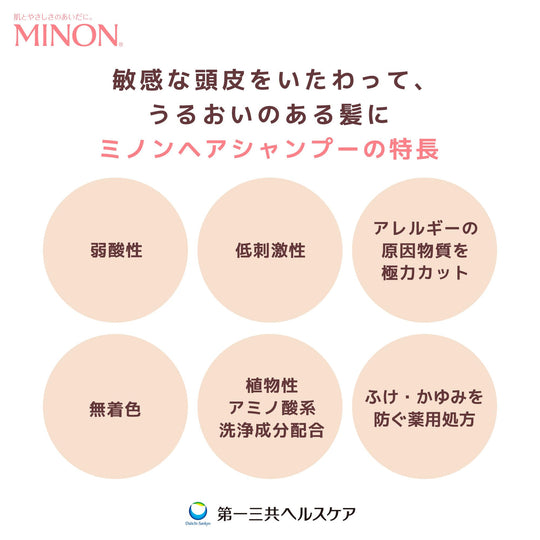 Minon藥用洗髮精專為解決頭皮和頭髮問題而設計,特別適合敏感或乾燥肌膚的人士。源自於消除化妝品過敏引起的皮膚問題的承諾,Minon的理念是無過敏性、無毒性和非鹼性。這款洗髮精使用植物基、氨基酸衍生的清潔成分,溫和地清潔頭皮和頭髮,同時保持必要的水分。其低過敏性和微酸性配方適合各年齡層,從嬰兒到老年人,特別推薦給有頭皮問題如癢、頭皮屑和異味的人士。洗髮精帶有淡淡的花香,不含色素、硫酸鹽和殺菌劑,溫和到可以每天使用,適合敏感肌膚。