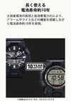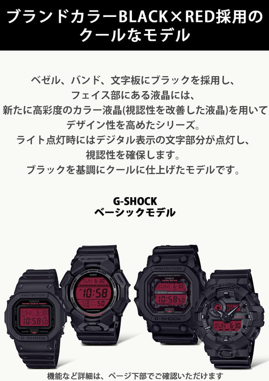 介紹G-SHOCK系列,這是耐用性和風格的象徵,採用標誌性的黑色和紅色品牌色。這些手錶專為耐用而設計,具備抗震和防水功能,防水深度可達20個大氣壓,非常適合各種環境。系列擁有時尚的黑色錶圈、錶帶和錶盤,搭配高飽和度液晶顯示屏,增強可視性。當照明時,數位顯示文字清晰可見,增強了手錶的功能性和美觀性。
