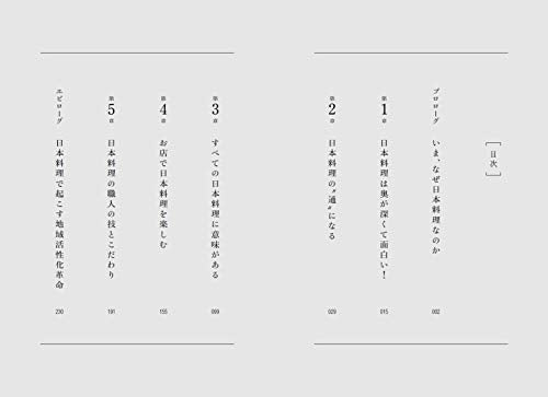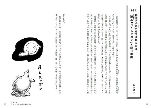 -----山葵、紫蘇、大根、菊花... 刺身的附飾不僅是裝飾。關東和關西地區的出汁(湯)和鍋物都不同。雜燴飯和鍋飯的差異在於有無出汁。關東和關西地區的"筋頭"是兩團不同的東西,起源於平安時代的一種工具。日本料理中用"精進料理"一詞並不局限於素食。雙陸和壽司其實是一樣的。稻是日本文化不可分離的一部分,其根源可以追溯到神話。大蘿蔔和胡蘿蔔的比例為8:2,使人聯想到紅白水引。長壽的祝福和人氣習俗與"御節"有關。御節中的"寶物"也被作為"調味劑"。為了使煮湯含有本味酒(日本米酒)的味道更化,大蘿蔔必須被徹底地"解除"。"起源篇"中鏡餅中的"寶物"是被作為"調味劑"的"供物"。鏡餅既是供物又是新年的裝飾,並且源於"三種神器"。
