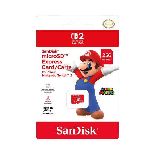 SanDisk microSD Express Card 256GB 是一款高速、官方授權的儲存解決方案,專為 Nintendo Switch 2 設計。具備次世代效能,這張記憶卡能夠擴充系統的儲存容量,非常適合用來存放遊戲、可下載內容及其他數位檔案。它也相容於原版 Nintendo Switch,但在較舊的硬體上傳輸速度可能會受到限制。