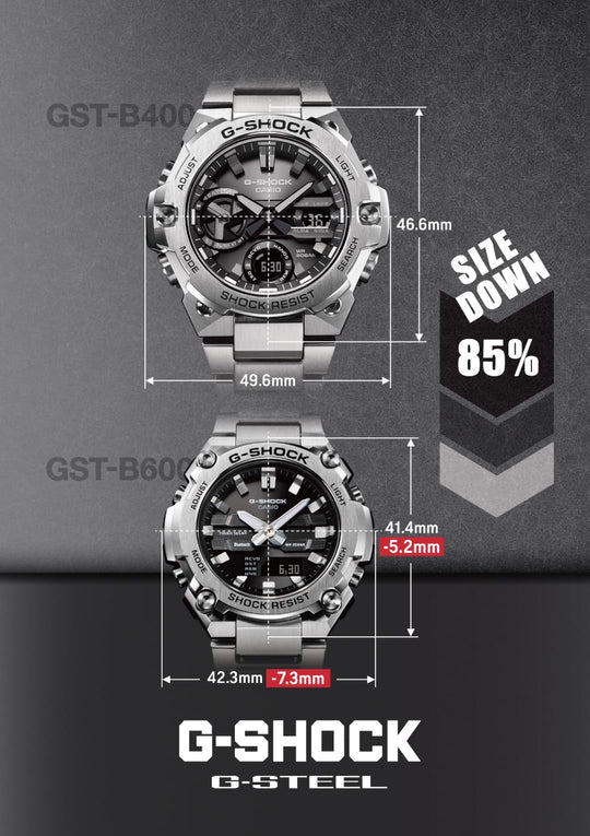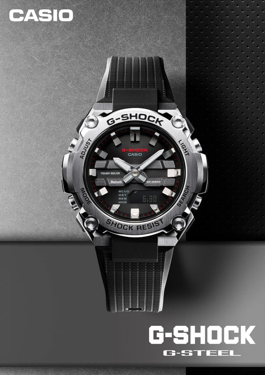 G-SHOCK GST-B600 系列是 G-STEEL 系列的一次重大進化,擁有歷史上最薄和最小的錶殼。這款創新設計結合了金屬和樹脂材質,打造出一款既時尚又耐用的手錶,適合休閒和商務場合。GST-B600 系列包含三款型號,每款都配有金屬錶圈,並提供黑色或紫色錶盤選擇,以及塑膠或金屬錶帶。