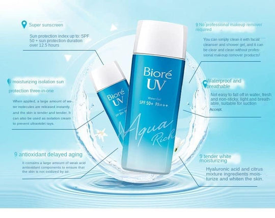 Biore UV沁透水感防曬噴霧 SPF50+ 是一款高效的防曬產品,能提供高度的防曬保護以抵禦有害的紫外線。其獨特的"外皮概念"創造了一層薄而均勻的防曬膜,如同第二層皮膚般覆蓋全身,預防到微觀級別的不均勻。此款防曬產品含有柔軟且滑順的水分囊,可預防皮膚乾燥,讓您的皮膚保持水潤並健康。它適合臉部及身體使用,並留下淡淡的白色鐵線蓮香味。為保持其效果,我們建議經常重新塗抹,尤其是在擦拭掉汗水後。可以輕易地使用洗臉露或是沐浴乳來清除。