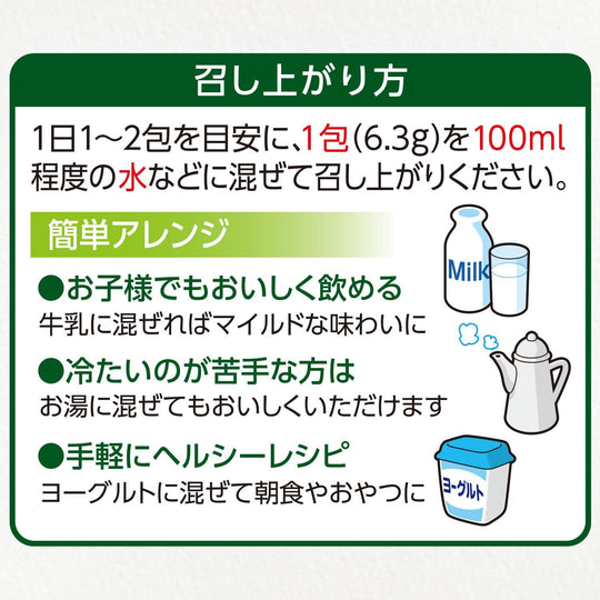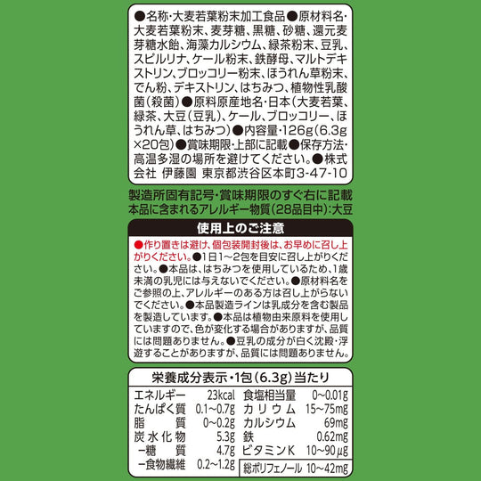 本產品是一種蔬菜青汁飲料,來自傳統的日本綠色飲品,由五種國內成分製成:幼大麥葉、西蘭花、羽衣甘藍、綠茶和菠菜。它還包括國產的蜂蜜和豆奶。此飲料只需要與水(每包100毫升水)混合即可口感絕佳。每包含有超過30粒幼大麥草粉末的細粒,以消除粉末感。它與豆奶粉和蜂蜜粉混合,口味略帶甜味。產品包括20包棒形包裝,便於攜帶並適合全家享用。