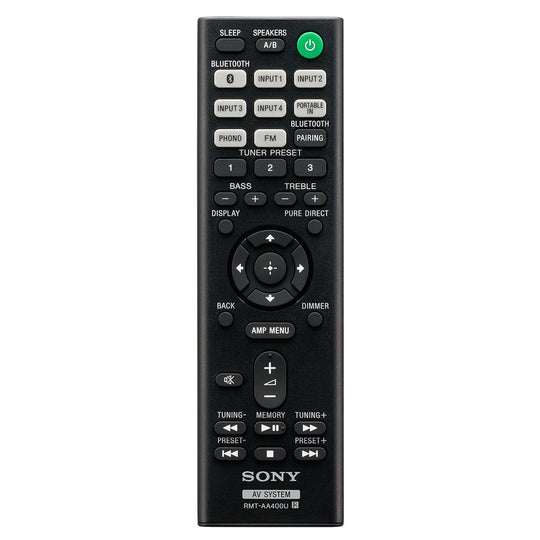 "產品規格","- 四個模擬線路輸入和一個唱機輸入(支持 MM 唱針) - 內建唱頭均衡器以便連接唱盤 - 唱機音量偏移功能,可調整唱機與其他設備之間的音量差異(可調範圍 0 至 +6dB) - 支持藍牙可無線播放音樂來自智能手機及其他設備 - 內建寬 FM 調諧器,具備預設 30 個 FM 電台的能力 - 附件包括:遙控器(RMT-AA400U)、2 顆 AAA 電池、FM 天線線、使用手冊和快速入門指南"