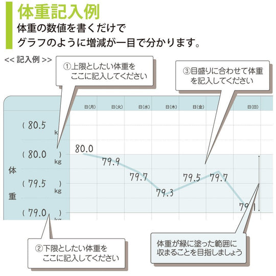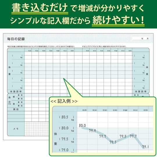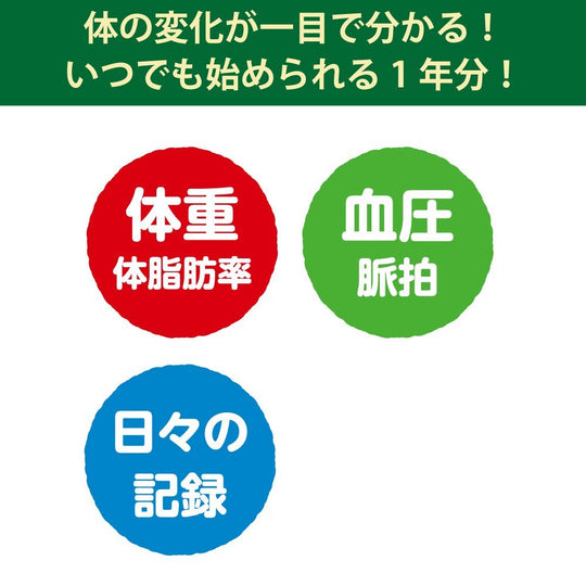 這本筆記本設計簡單易用,方便您追蹤健康指標。只需寫下您的體重,並使用簡單的記錄框來追蹤進度。除了體重,您還可以記錄血壓、體脂率、脈搏、步數及其他運動數據。您也可以記錄每天的身體狀況。